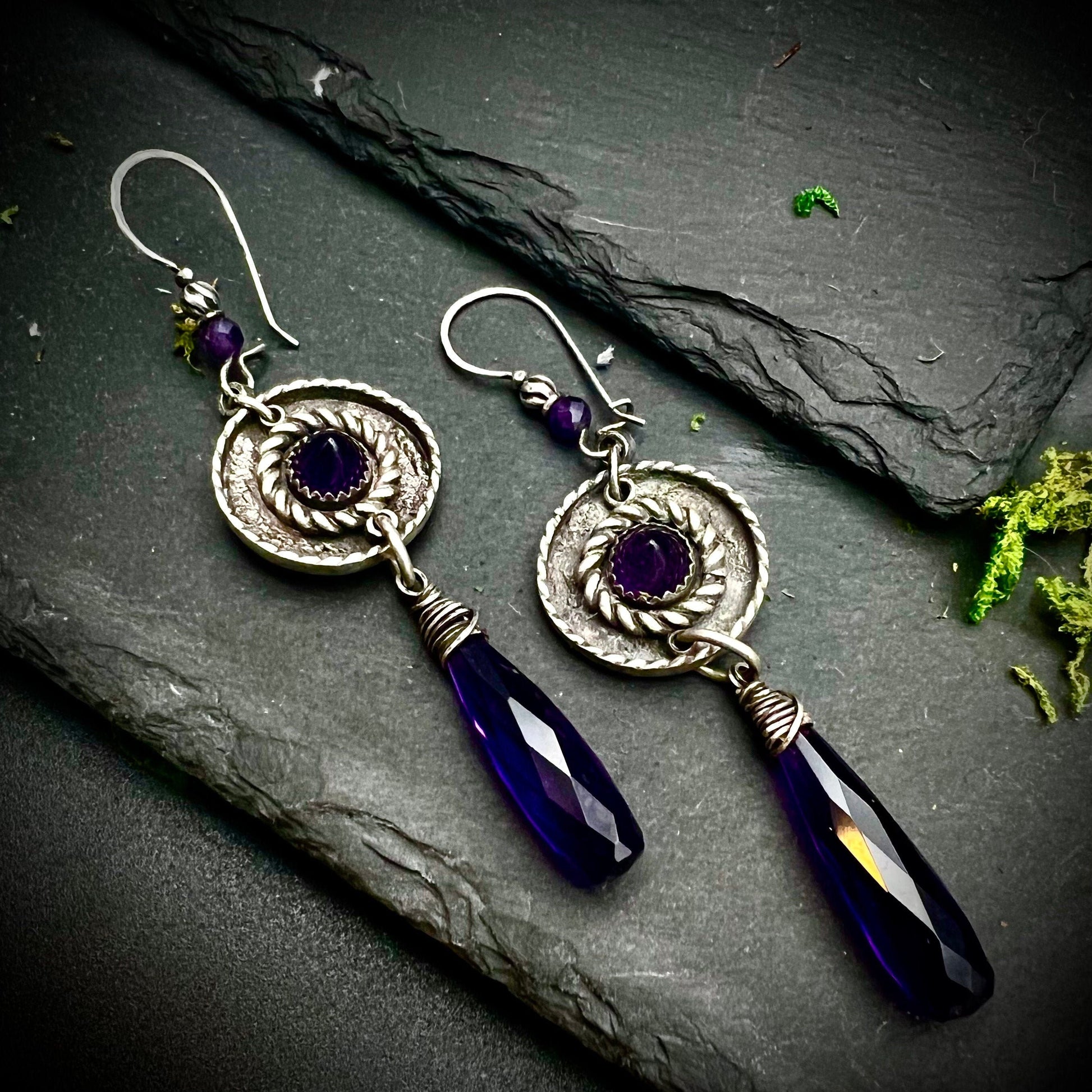 Generous, yet light-weight, these cascading, deep purple amethyst briolettes hang from concentric circles of patinaed sterling silver which has been set with bullet-cut amethysts and finished with latch-back customer earwires with sterling and faceted amethyst beads.