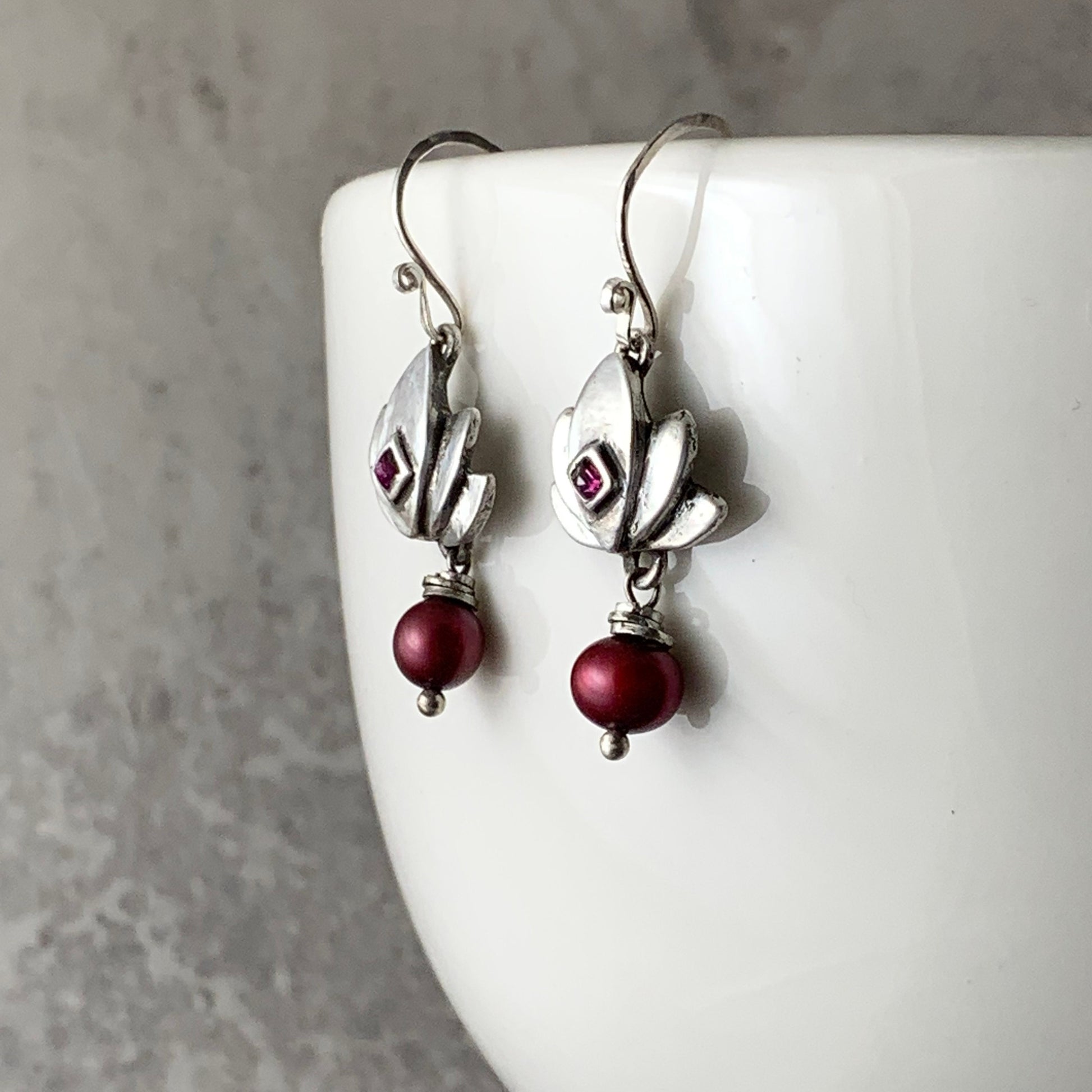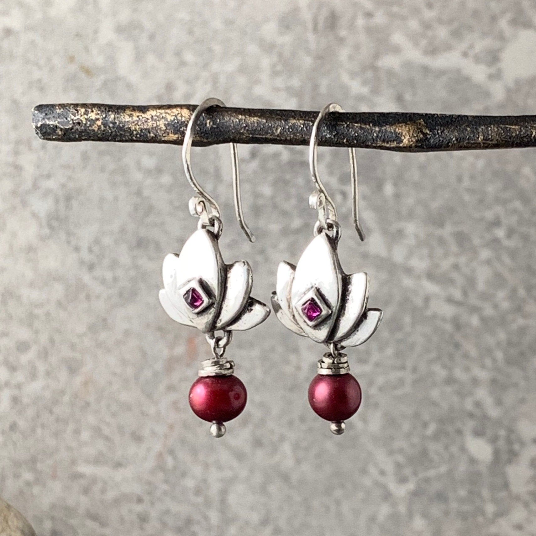 Dainty lotuses of .999 fine silver are set with square ruby stones and paired with juicy, deep pink freshwater pearls and sterling silver rings and finished with handmade, sterling silver earring wires.