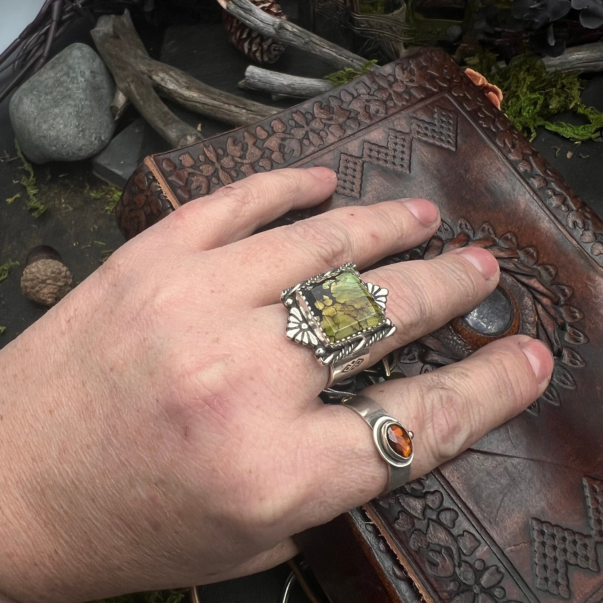 A step-cut square of Bamboo Mountain turquoise is set in sterling silver and rests on a wide, stamped silver band.