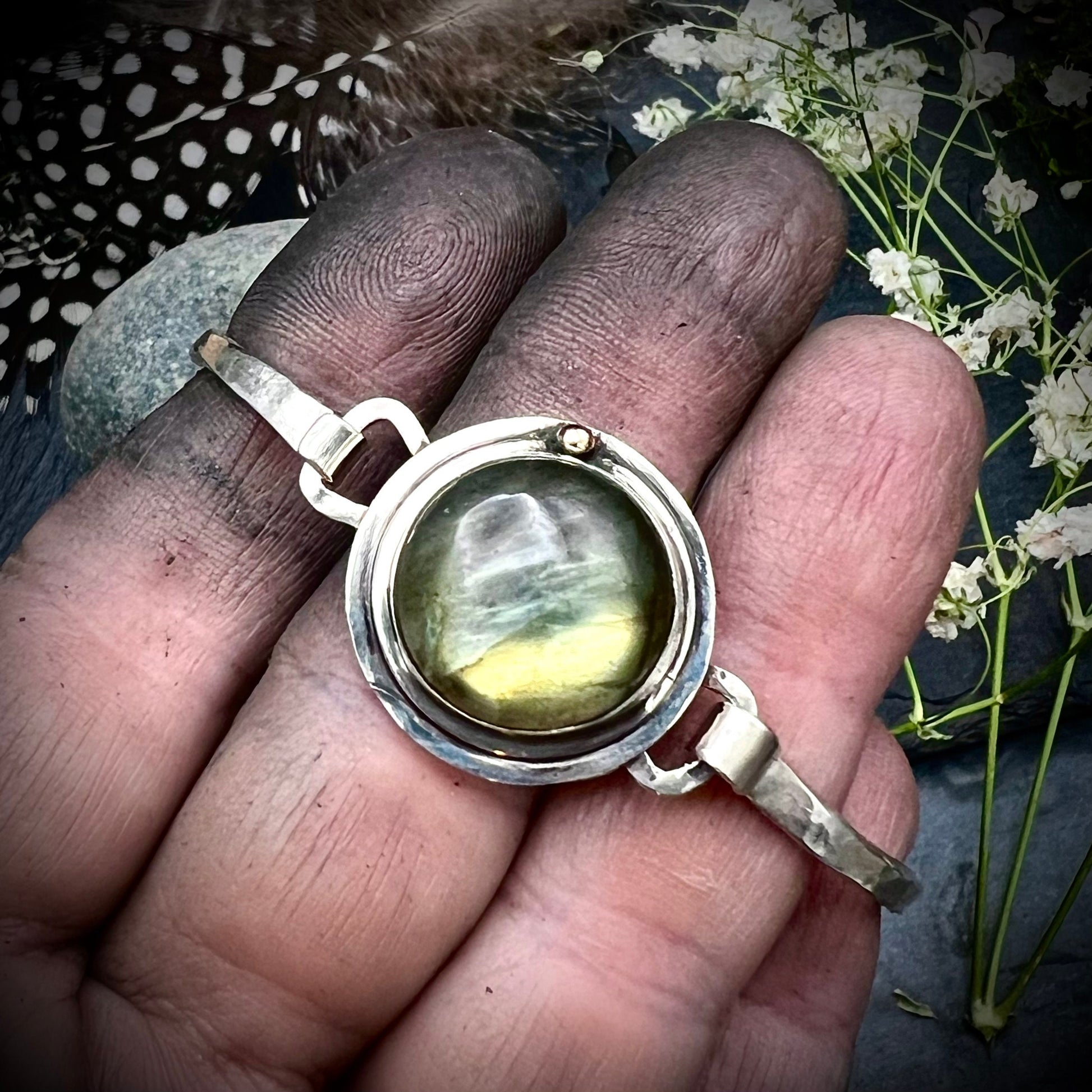 A hammered silver cuff is brought together into a tension setting with a clasp made of sterling silver and set with a large round gold and green flash labradorite cabochon and finished with a 14kt gold ball.