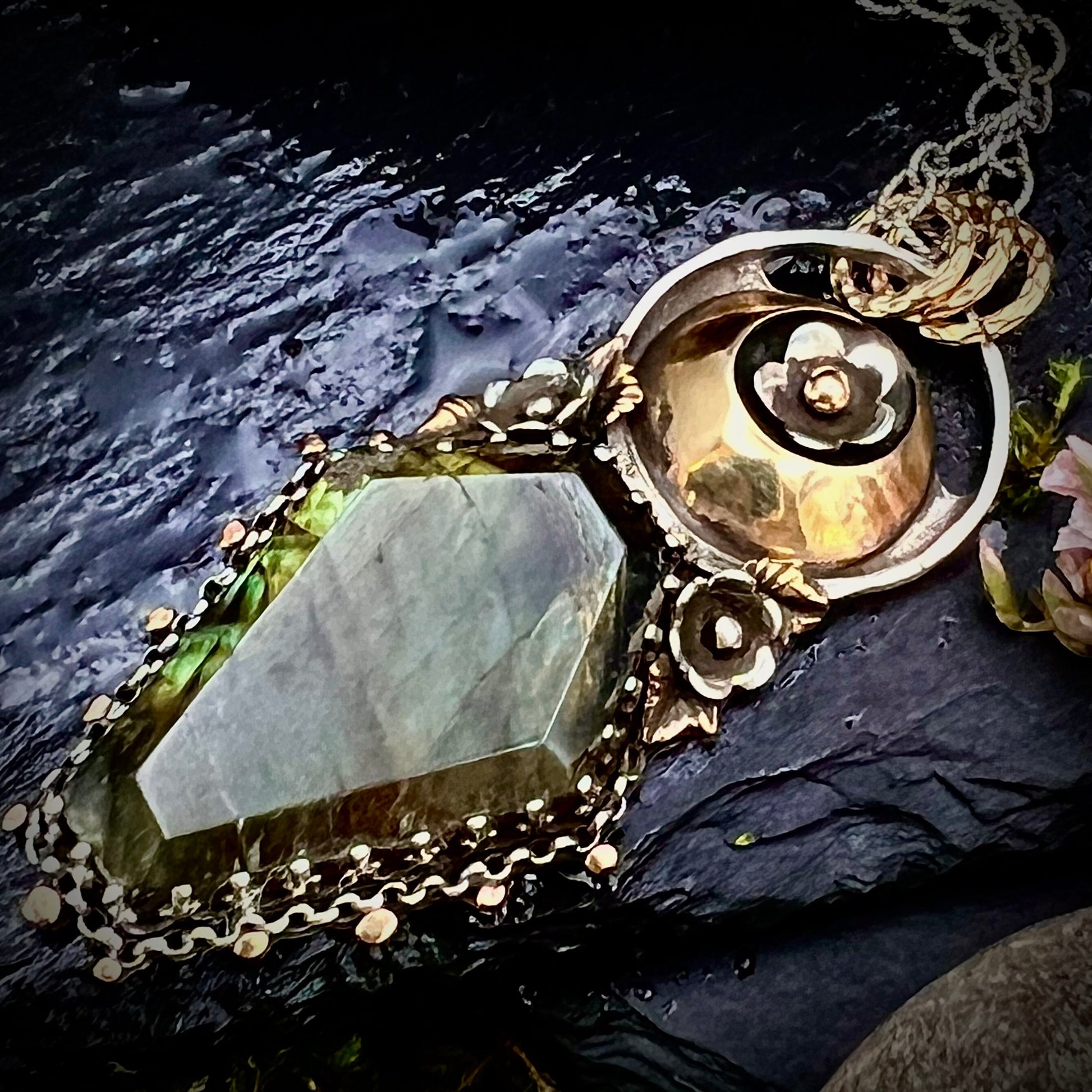 A large flashing labradorite gemstone has been cut and polished into the shape of a coffin and is set into a gothic bezel of sterling silver. It is crowned with a gleaming bronze moon and accented with sterling silver flowers and gold-filled accents.