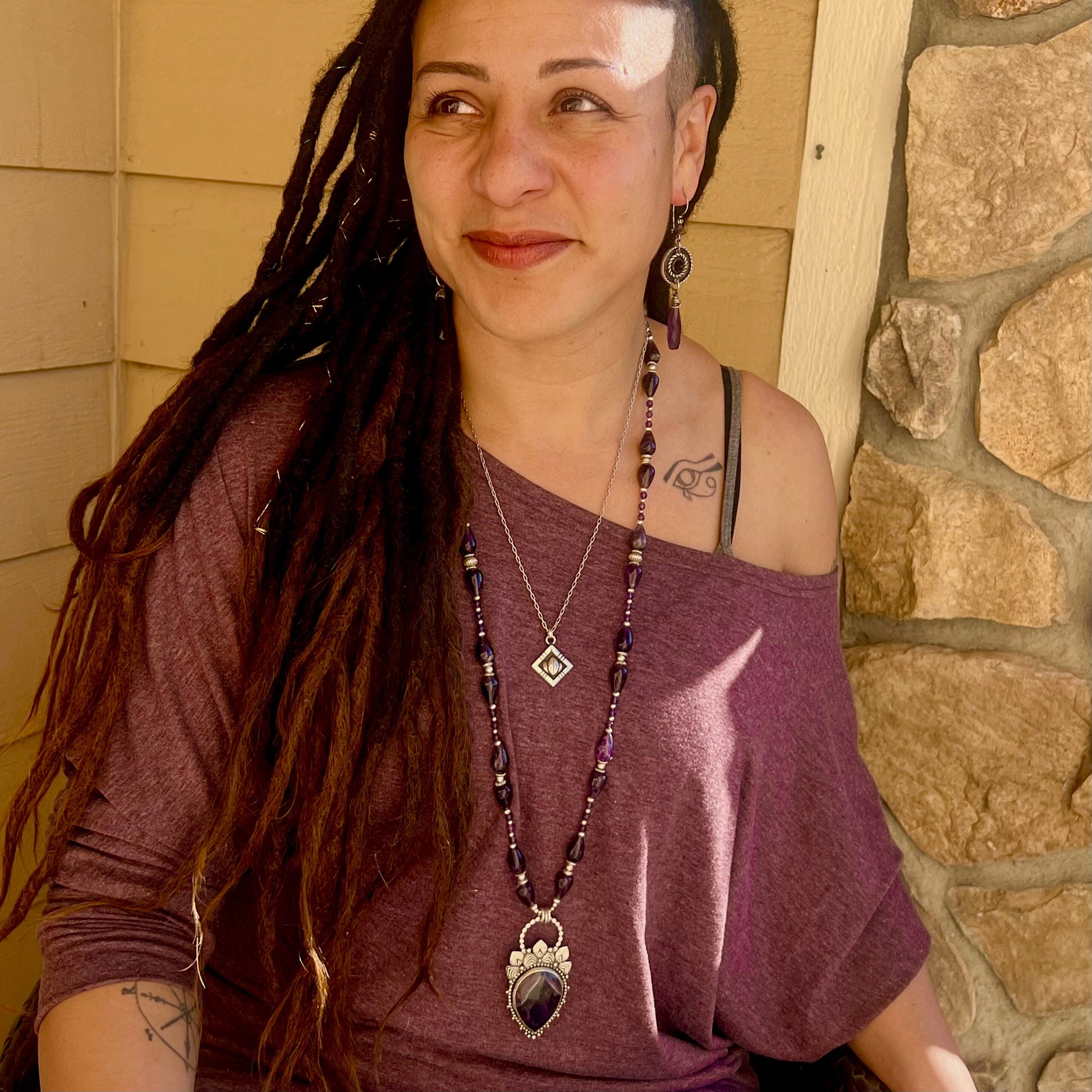 A huge chevron amethyst teardrop cabochon is at the heart of this bold piece. Accented with fine silver reverse drops, large sterling silver beads, and even larger amethyst teardrop beads this piece is perfect for any lover of the purple gemstone.