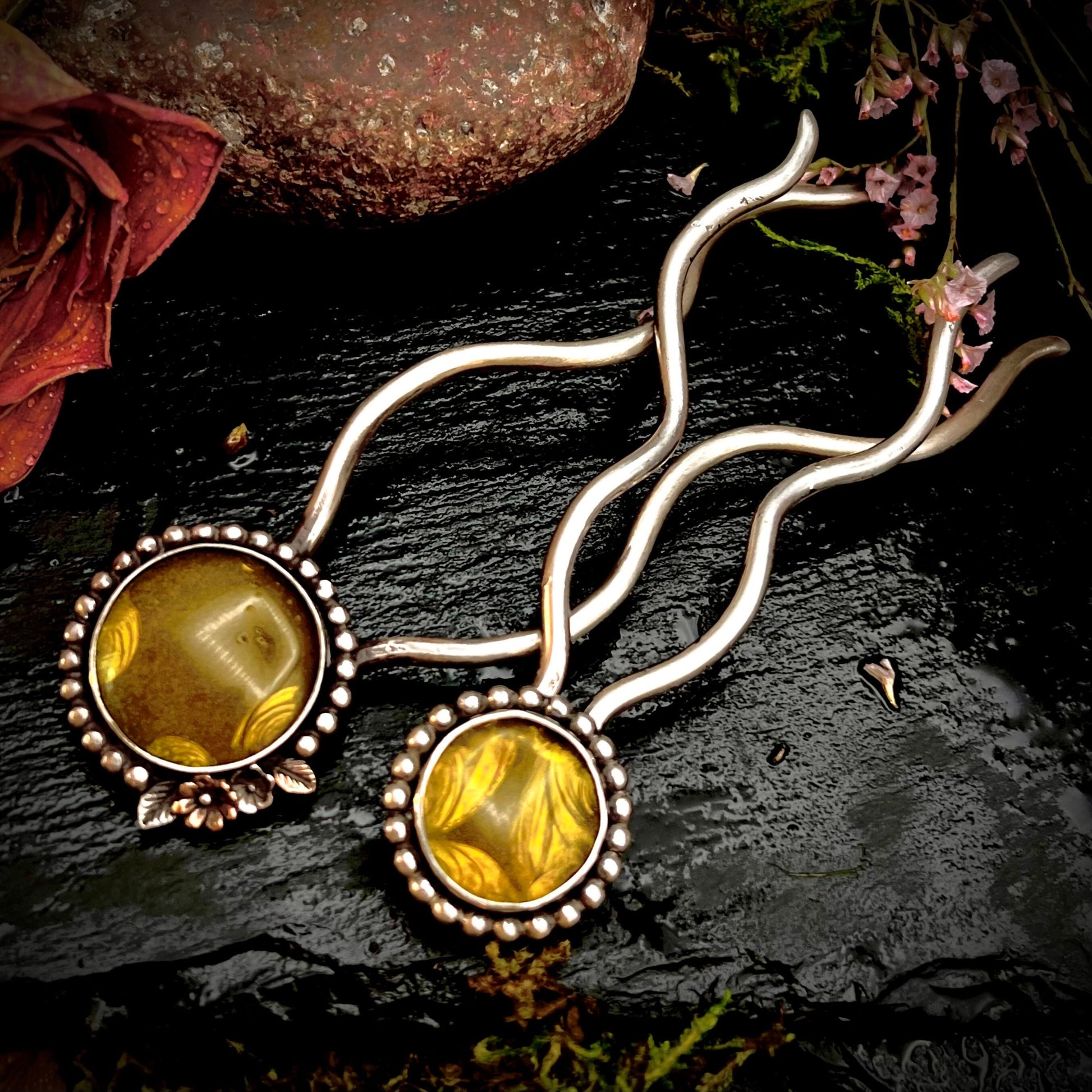 Large Green Rosarita and Silver Hair Pin with Floral Accent