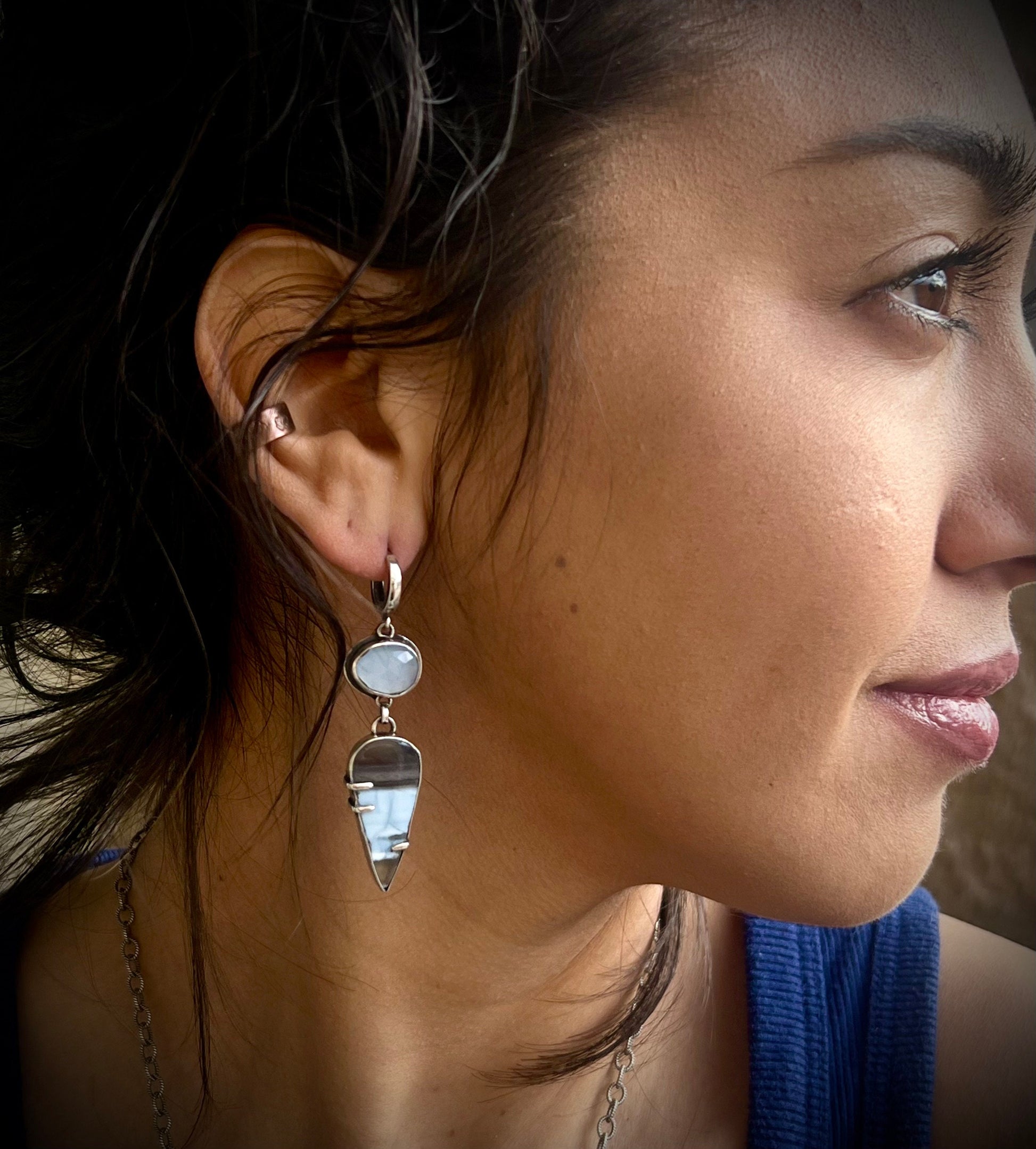 Atop, these sit rose-cut dusky blue chalcedony in sterling silver.