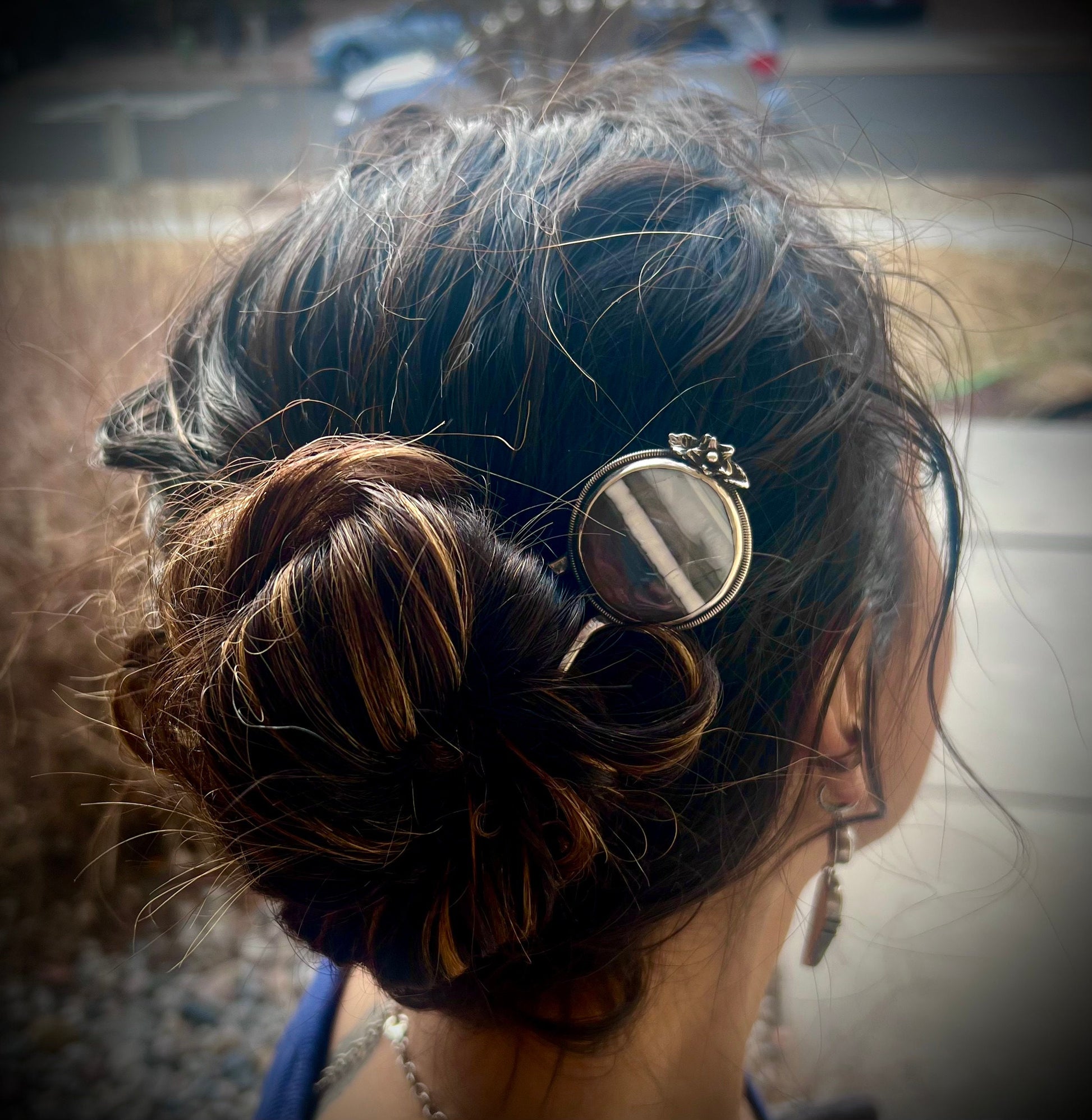 - Hairpin measures approximately 5 1/2 inches (14 cm) and is best used on hair that falls just below shoulder length or longer.