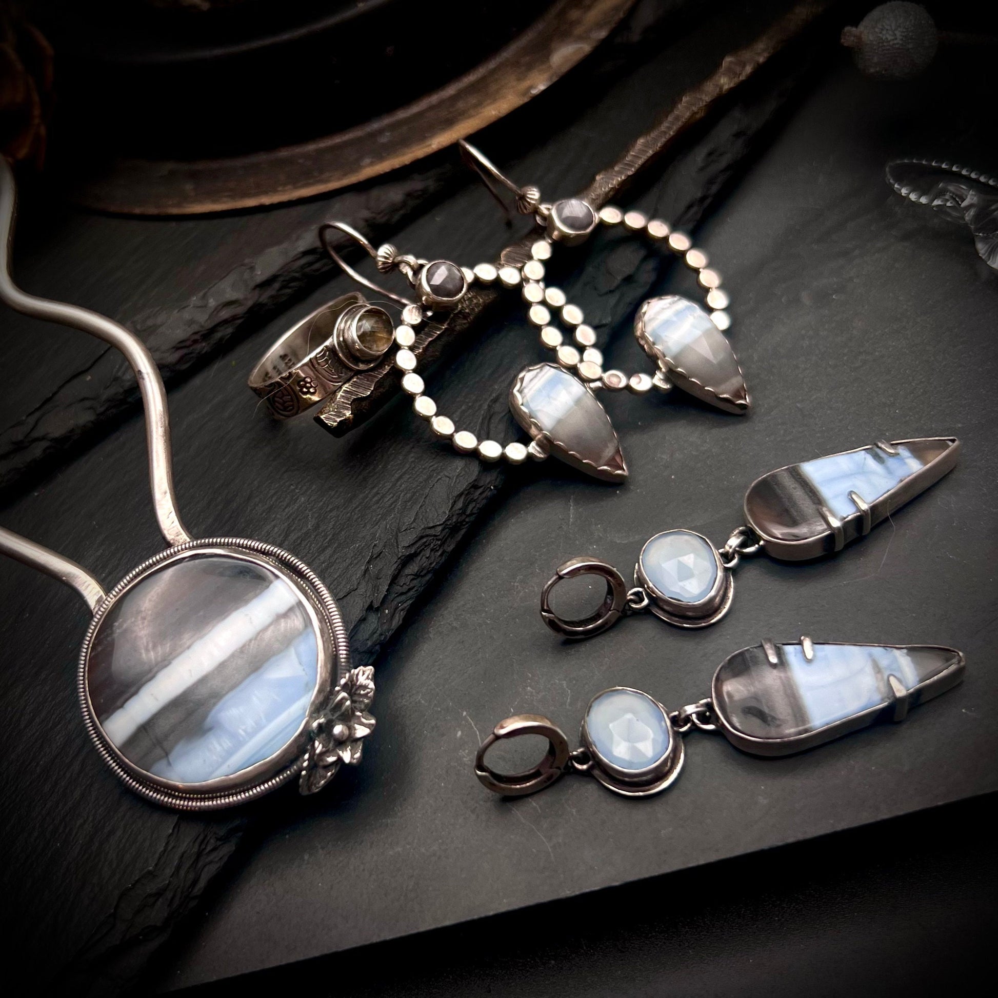 A large Owyhee Opal cabochon is set in sterling silver with a hand-forged silver flower as an accent. It is then soldered to large gauge sterling silver prongs.