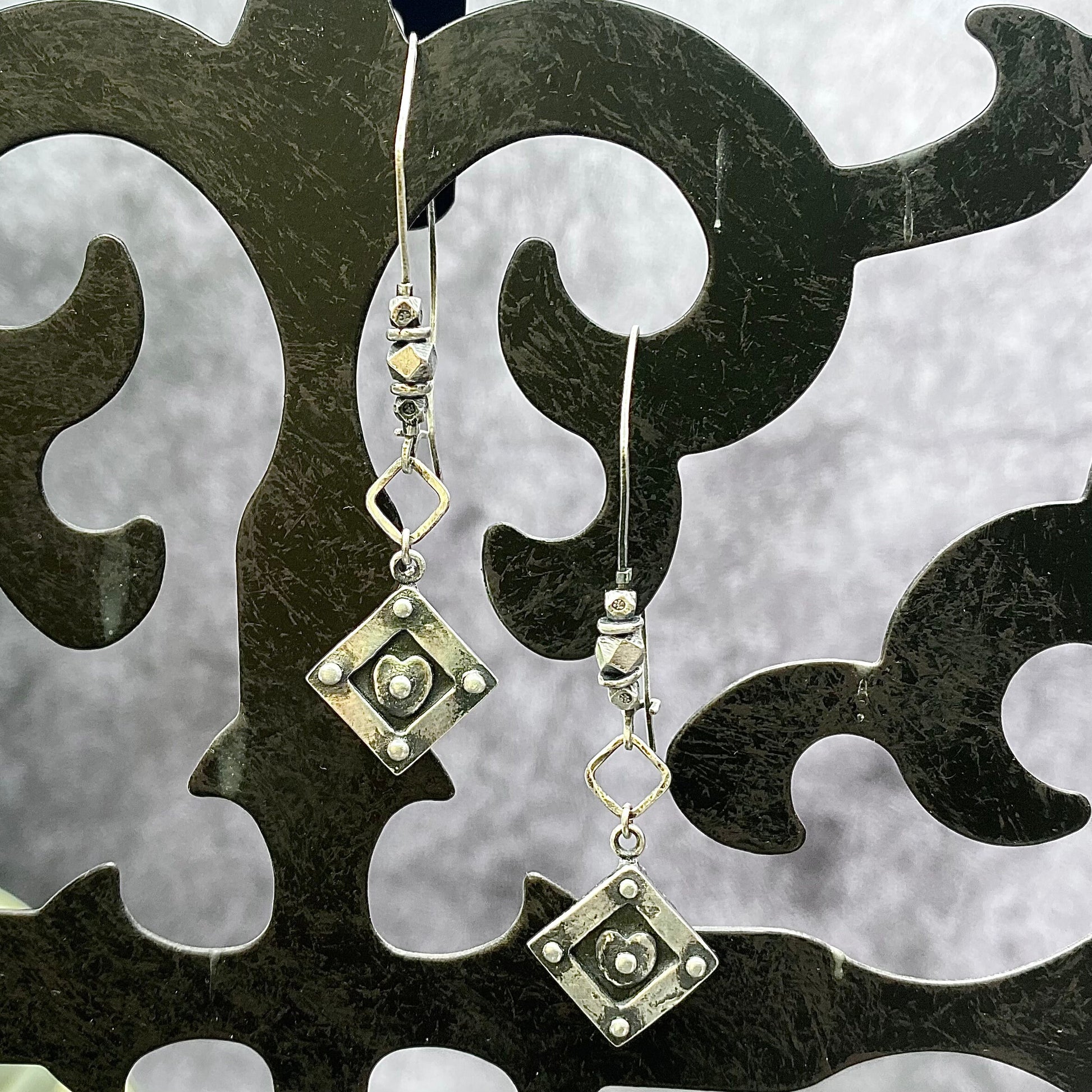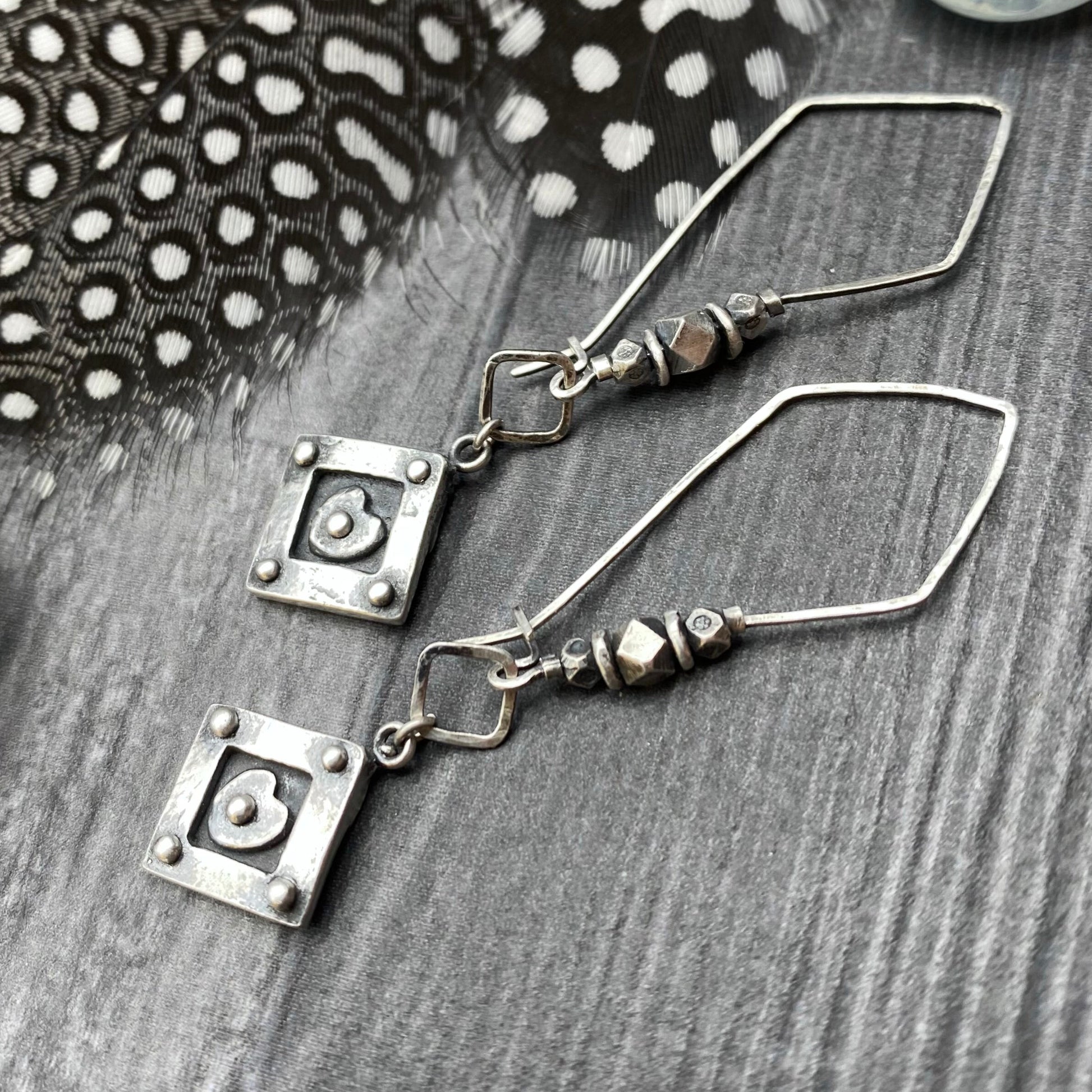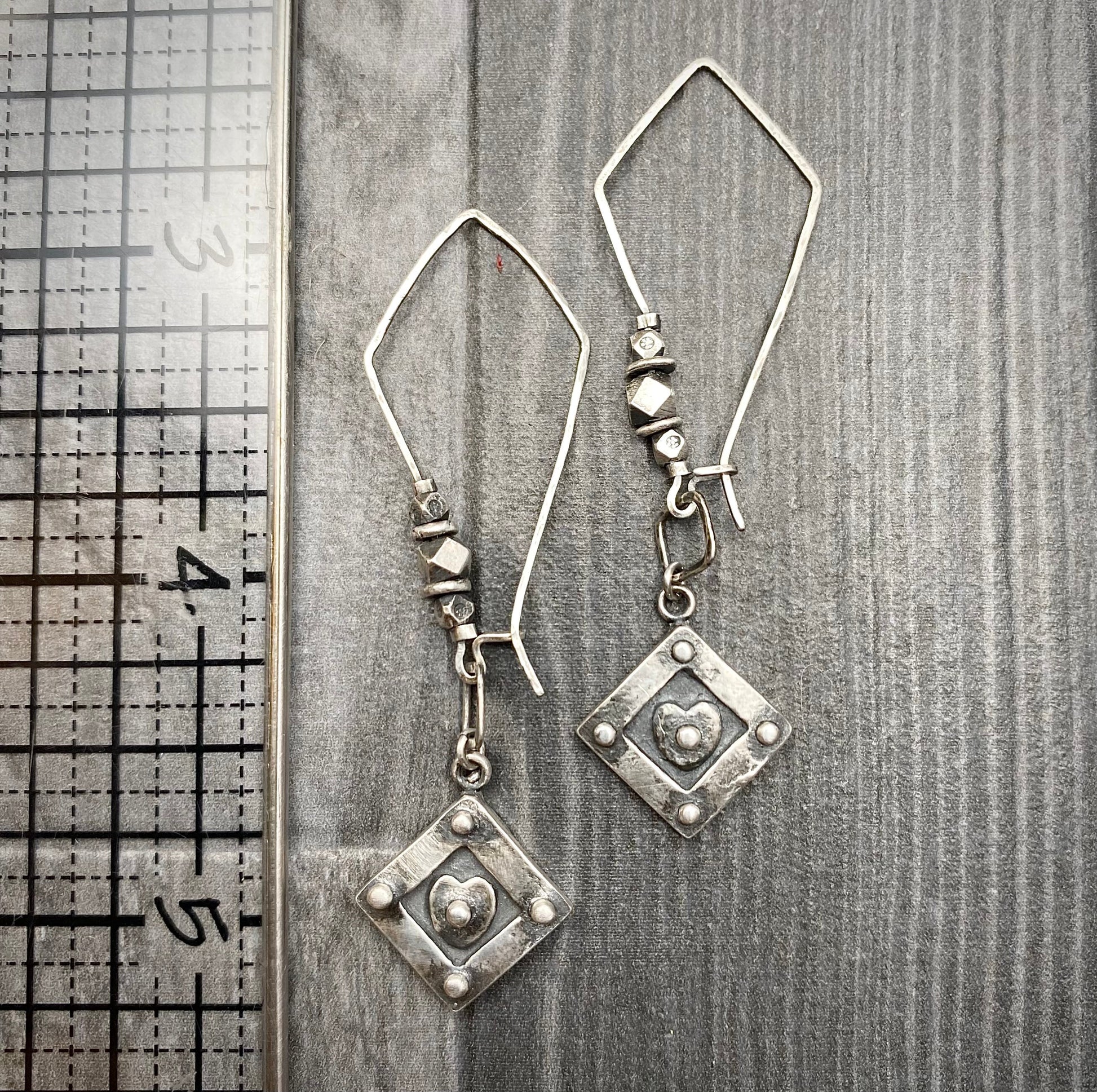 Squares of fine silver hold small hearts and are set on oversized, sterling silver earring wires that have been adorned with a stack of sterling and fine silver beads.