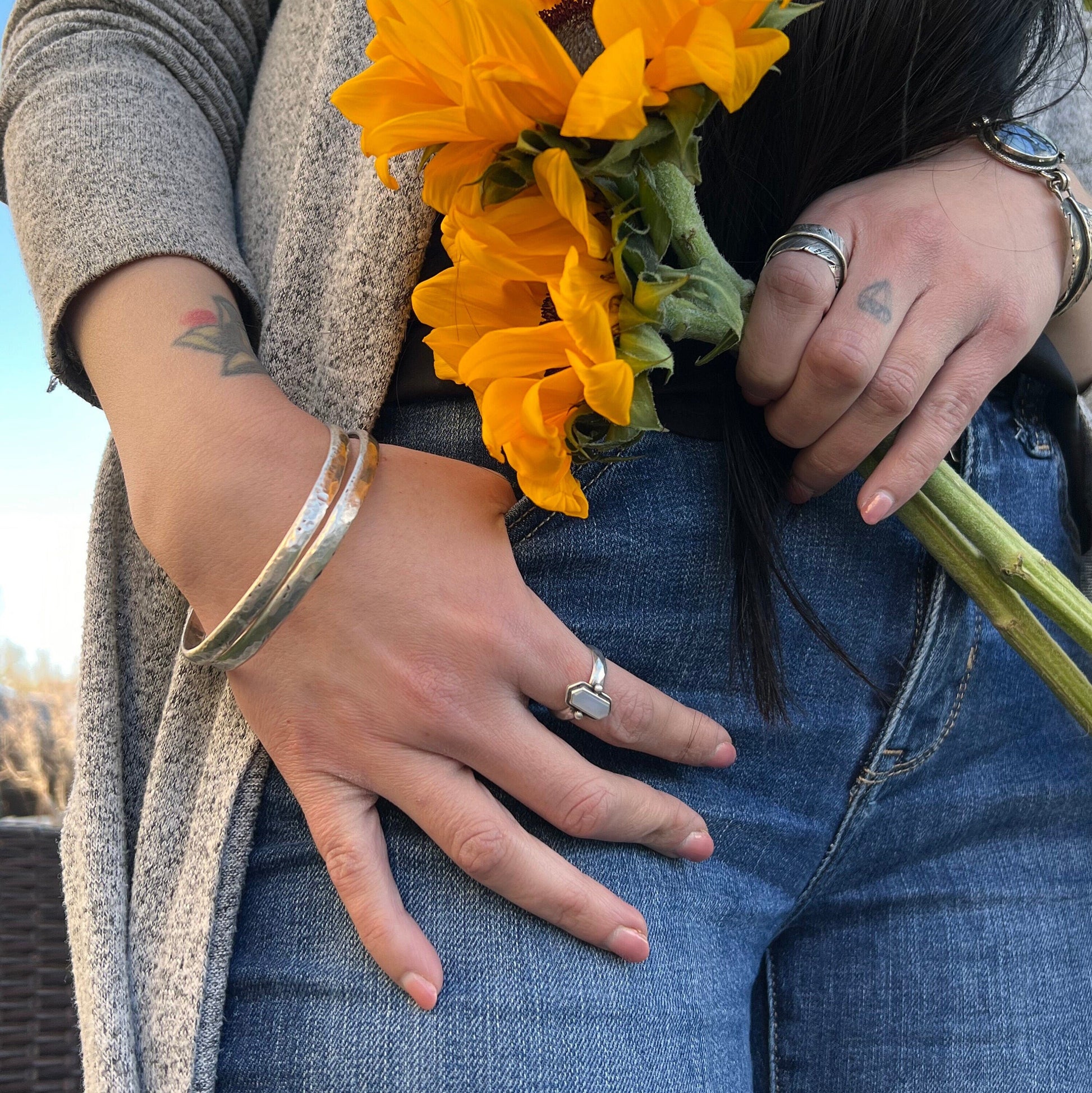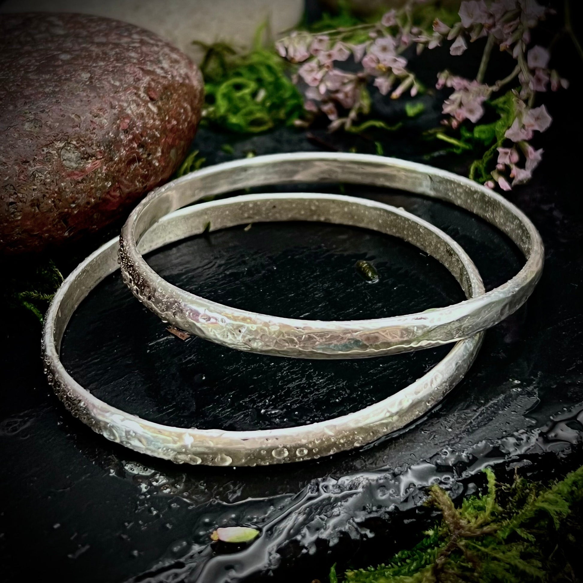 Thick domed wire had been hammered to create this weighty set of organic bangles