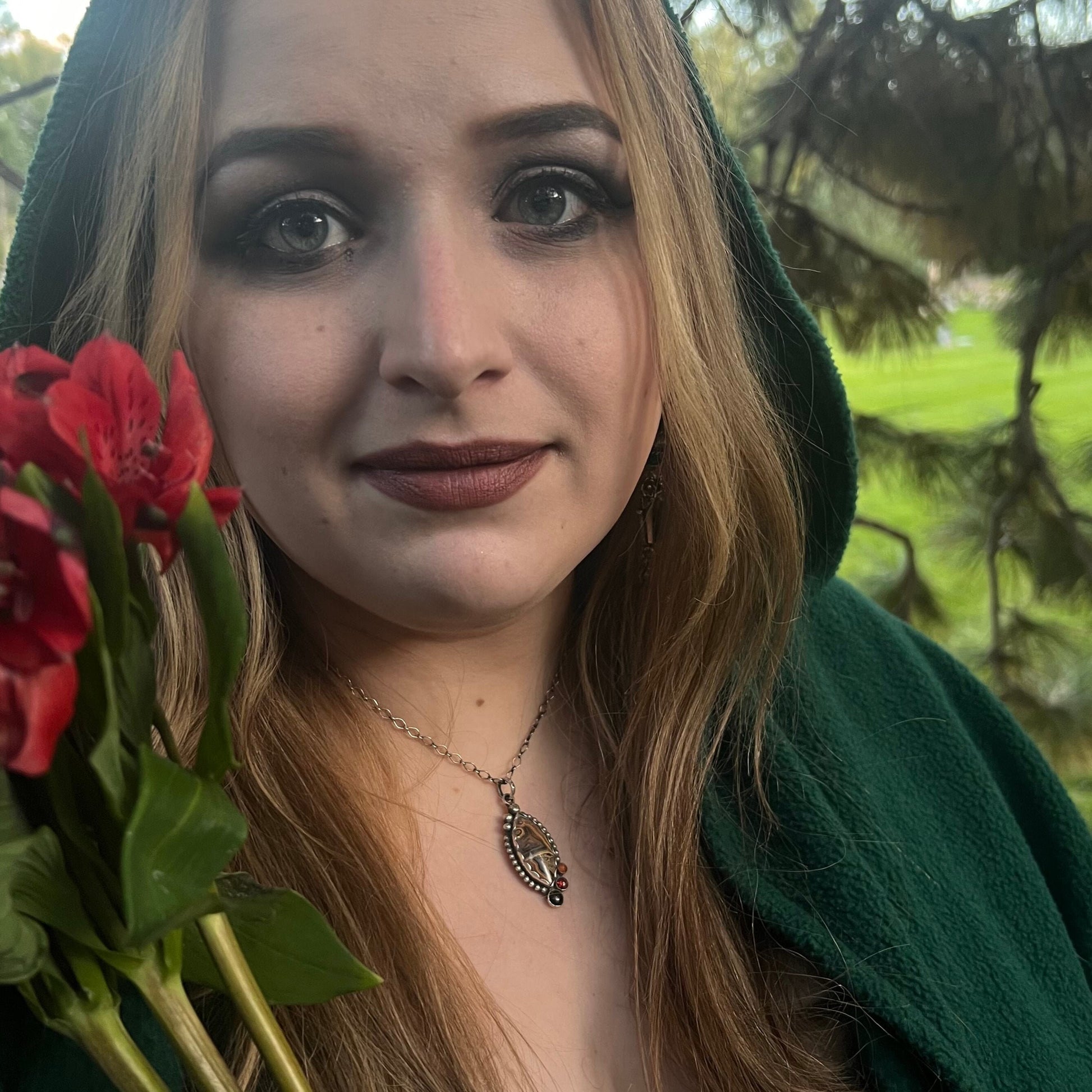 A marquis cut tube onyx cabochon is set in sterling silver and accented with onyx, garnet, and carnelian cabochons. It sits on an 17 inch sterling silver chain with lobster clasp and gemstone drop.