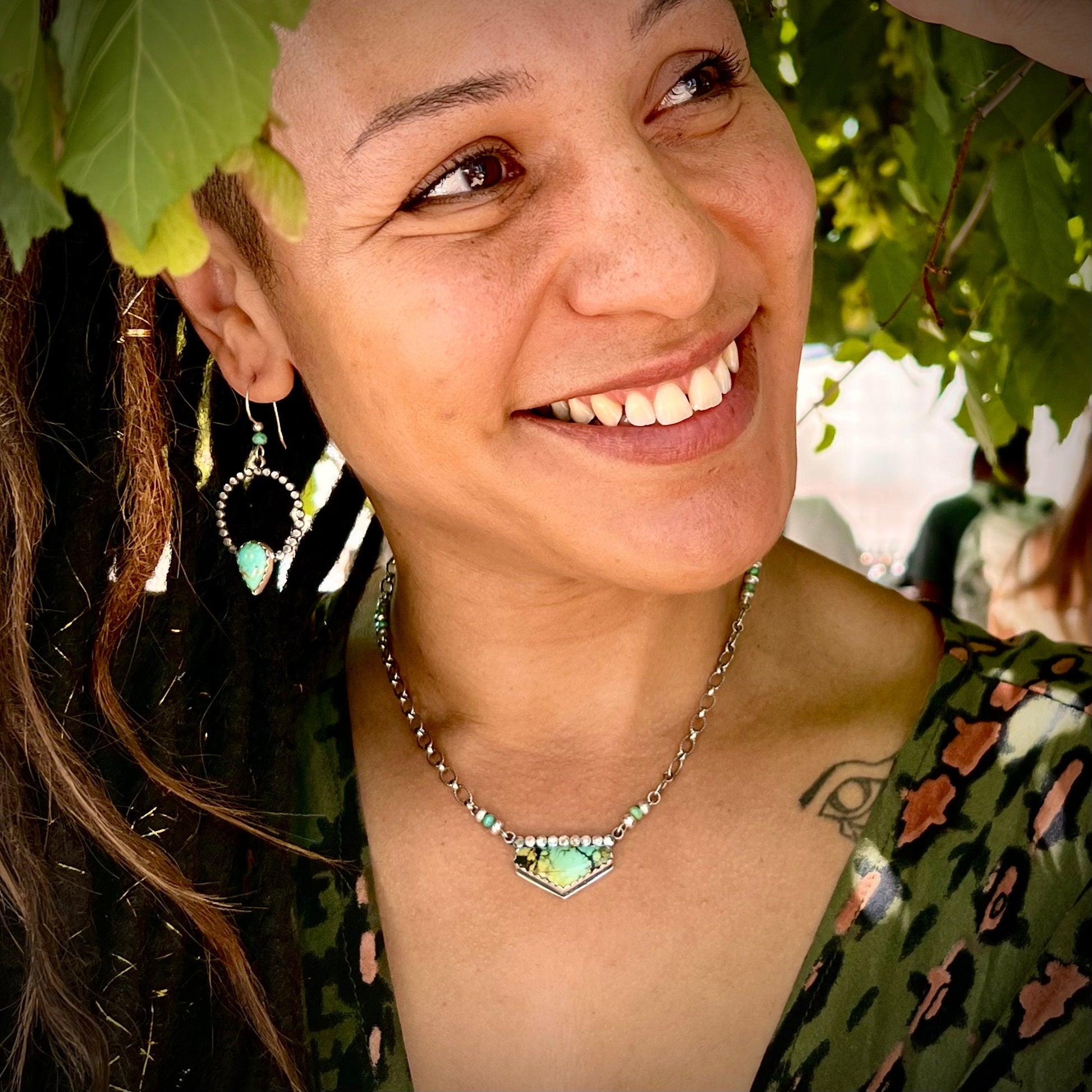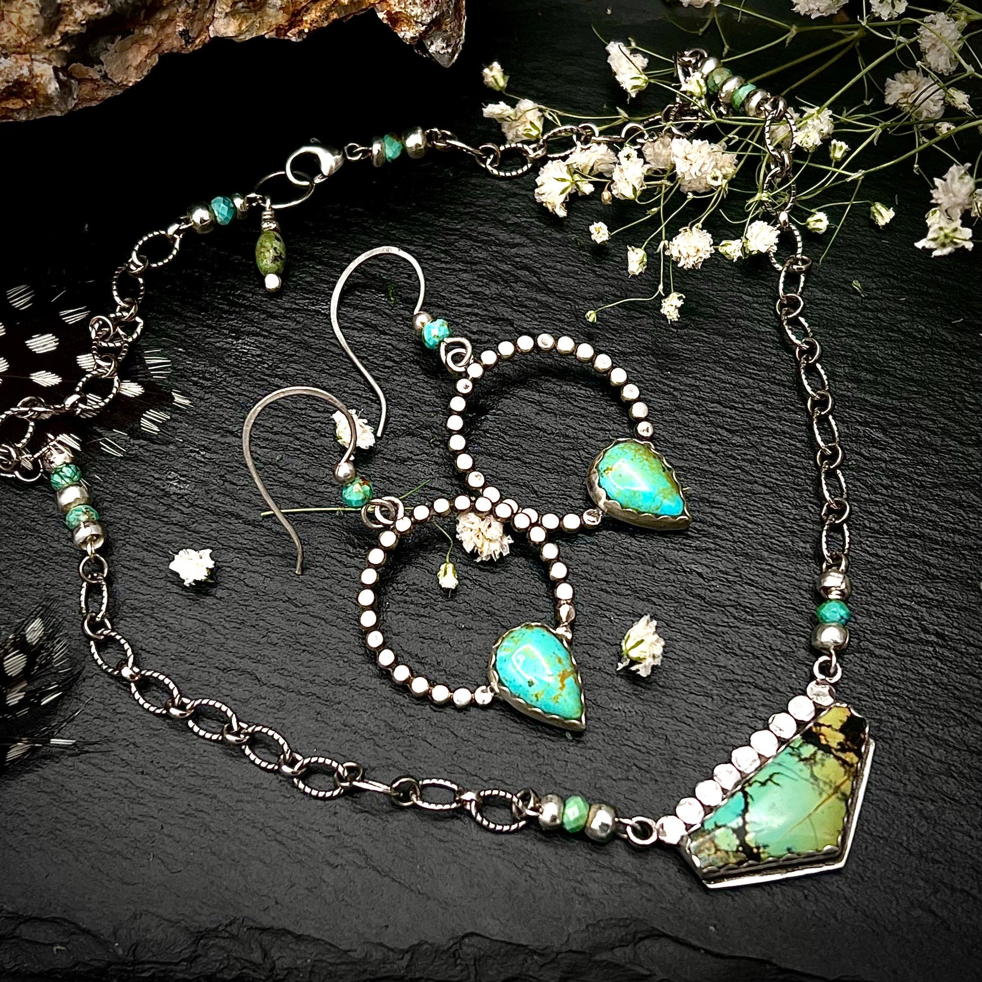 In shades of blue and gold, this shield-shaped cabochon of Wild Horse turquoise is set in sterling silver and hung on a chunky sterling chain that has been accented with turquoise beads. The piece is finished with a medium lobster claw clasp and turquoise beaded drop.